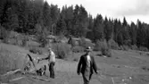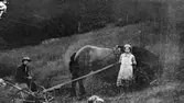 Häljesgården. Erik Gustavsson kör ogräsharv, år 1954.