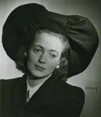 "Modell NK. Svart filt". Modell i hatt, stor, påsig.