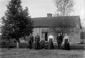 FAMILJEN STÅR UTE PÅ GÅRDSPLAN, MANNEN HÅLLER EN HÄST.