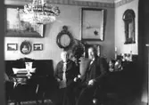 Irsta sn, Gäddeholm. Interiör av sal i Gäddeholms herrgård. Med Öppen spis, soffa, bokhyllor, jordglob, porträttmålningar m.m.