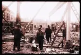 "Garage Friggagatan. Sydvästra gaveln - interiör under takstolarnas resning."