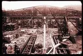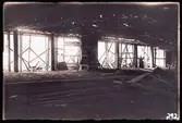"Garage Friggagatan. Sydvästra gaveln - interiör under byggnadens uppförande från övre handförråd mot nordost."
