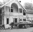 Lastning av virke på godsvagn. Text på truck: "Jämtskogens Trä AB Östersund".