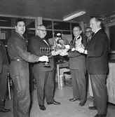 Arbetsdagen är slut. Män cyklar hem från CVA, Centrala Verkstaden Arboga. I bakgrunden ses bilparkeringen, byggnaden där vakten sitter och har kontroll på grinden som alla måste passera.