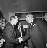 Arbetsdagen är slut. Folk strömmar ut genom grindarna vid "vakten" (byggnaden till vänster) på CVA, Centrala Verkstaden Arboga.