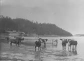 Enligt fotografens noteringar: "Anna på Sötekullens barn med korna utanför stugan. Var anställd anställd på kontoret vid Munkedals bruk."