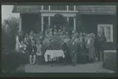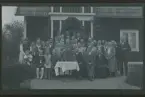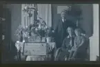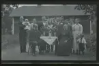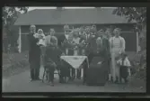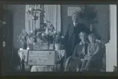 "Mor 80 år." Fotografens föräldrar Fredrik Vilhelm Eriksson och Anna Maria står vid ett bord med gratulations-blommor.