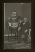 "Viktor Karlsson, Hedäng" En man sitter vid ett bord medgratulations-blommor.