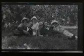 "Fogelstad." Ett sällskap ligger lutade mot varandra ute i gräset.
