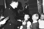 Polismannen Sven Wetterstam gör stopptecken för trafiken, 1949. "15 yrken - 15 NK fönster".