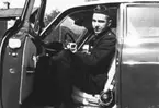 Trafikpolis som dirigerar över bilar till högertrafik, på Norrbro, framför kungliga slottet.
