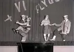 Göthman, Handikappfest, 18 maj 1967 En person i silverdräkt och med en hjälm med antenner på sitter på en gunga som hänger i taket under en revyföreställning på teatern. En kvinna med en kort, randig och ärmlös klänning står med ryggen mot kameran och tittar på. Hon står invid en mikrofon. Sex personer sitter på stolar i bakgrunden.