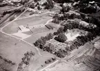 Eva Sundell jobbar på kyrkogården 3 juni 1965 Eva Sundell iklädd vit blus, vita shorts och sandaler på fötterna arbetar på kyrkogården. Hon bär glasögon. Hon krattar sanden på en grav. Mitt på graven står en vas med blommor i. Även framför gravstenen på graven finns det blommor. Andra gravar syns runtomkring.