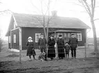 Svartå Herrgård 1 28 juli 1966 Fem vuxna varav två herrar, tre damer samt även tre barn befinner sig i trädgården på Svartå Herrgård i Örebro. En tax finns också med på bilden. En av herrarna har ljus kostym på sig och den andre herrn röker pipa. Personerna sitter på två bänkar.