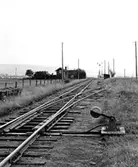 Järnvägsspår, båtbrygga, sjö.