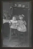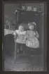 "Backa." Två små barn sitter i en karmstol.