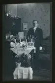 "Valfrid Larsson, kusk på Fogelstad." Porträtt av en man som står vid ett bord fullt av gratulations-blommor.