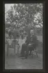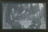 "Nilslund." Ett sällskap poserar i en trädgård, en äldre kvinna sitter i en korgstol vid ett litet bord med duk och gratulations-blommor i vas.