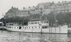 Foto i svartvitt visande Waxholmsbolagets passagerarångfartyg Storskär under gång i Stockholms skärgård.