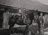 TVÅ BARN, EN AV DEN SITTER PÅ EN HÄST UTANFÖR STALLET.