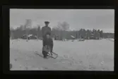 En man på skidor och en kvinna på sparkstötting tålkar efter en hund (Newfoundlandshund). Walborg Norlin, Klostergatan 17, Örebro.