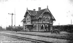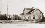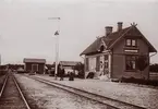 Resenärer vid stationshuset i väntan på tåget för resa till Kinnekulle i oktober 1915.