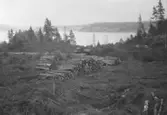 Enligt tidigare noteringar: "Virkesmagasin i vatten i bakgrunden brädgård fär torkning av sågade trävaror."
