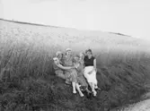 Justina Johansson på Huset och hennes dotter Ida, Krokstads socken i Sörbygden, fotograferade framför stengärdsgård, potatisodlingen och bostaden.