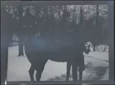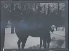 Ungdomar från Risätra på slädtur. Fr.v.: systrarna Lissola-Tilda och Lissola-Johanna, Martin Snäller, Lissola-Johan, två okända män, Kvarnmyr-Lars och Emil Johansson (Branäs-Emil). Två hästar med slädar.