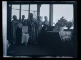 Ett sällskap med både kvinnor och män i sommarkläder framför en byggnad. Några spelar tennis, dubbel, medan andra är åskådare.