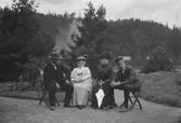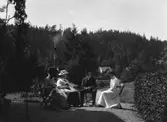 Handarbetande sällskap sitter vid trädgårdsbord, utanför ett hus. En kvinna syr, en kvinna knypplar och en man läser en tidning (eller skriver). Avfotograferad akvarellerad teckning (21.7 x 16.2 cm.) av Fritz von Dardel (1817 - 1901). Daterad 12 juni 1880. Montebello, Östra Ryds socken, Danderyds skeppslag i Uppland.