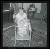 Porträtt av pojken Lennart Berndtsson som sitter på en gunghäst i en trädgård. Solhemsgatan på Solängen i Mölndal, cirka 1955.