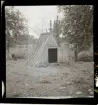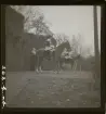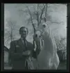 En kvinna med katt i famnen, står på innergård7 i trädgård. Björkholmen, Karlskrona.