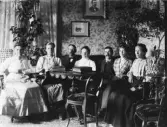 "Hemma hos familjen Sandlin i Hybo: fr.v. : Anna, Ester och Gustav Sandlin, dennes fru plus okända. O. G. Sandlins porträtt".