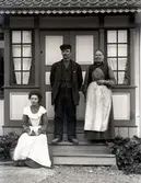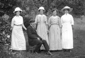 Bildtext till kopian i fotoalbumet: "Gunnesbo. Fr. vä. Martina Ödman f. 1874, Ottilia Hanssonf. 1876, Alma Leander f. 1876, Sigrid,". flickan: Ingrid Karksson, Hulda Gren f. 1878, Axelina Bengtsson f. 1871. Sigrid Karlsson (syster till skollär. Karlsson) Sigrid Johansson f. 1884".