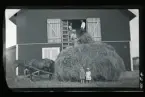 Jordbruksarbetare på hästdragen harv (?). "Anton och Harry Karlsson, Fogelstad. "