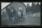 En man på en kärra dragen av två hästar, framför ett hus. "Gustav Karlsson, Fogelstad, 1923. Vid statar-byggningen Görsbacken / A-LE."