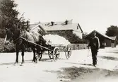 "Åkare-Axel" kör ett lass socker på Gamla vägen (= nuvarande Skaraborgsgatan) omkring 1910. Längst till höger syns doktor Königs gård. (Tomt nr 52, 53, 54) Axel Emil Karlsson, åkare. Född 1863 i Skara Död 1926 i Skara Bodde år 1900 å Oxbacken nr 6 o 7.
