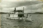 Frånö Cellulosafabrik vid Ångermanälven. Bogseraren "Rosse" med timmergrimman utanför Frånö.