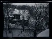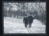 Två kvinnor på skidor, på tomten till familjen Morthensens villa Solveden, Djursholm.