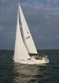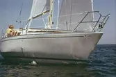 Två män i sittbrunnen på en Scampi 30 vid en brygga.