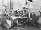 "Kafferep vid Stavsnäs, Djurö, Uppland. Ett sällskap män och kvinnor, alla iklädda hatt sitter vid ett bord utanför ett hus. De dricker ur glas, några skålar. Ett par av kvinnorna handarbetar. "
