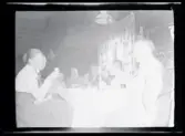 Födelsedagsfirande. Två män, fr v Julius Johansson och Johan Johansson (?) sittande vid ett bord med varsitt snapsglas och en butelj. Johan Johansson fyller 70 år. Lelle-Larsa, fastighet Skärte 4, Rolfstorp.