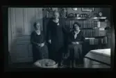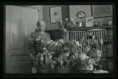 "Fröken Ester Lindholm, Laggartorp." En kvinna i ett rum med en mängd gratulations-blommor.