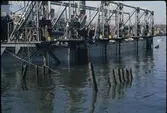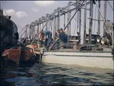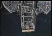 Vasa har kommit över vattenytan och hänger här i vajrar mellan bärgningspontonerna, Oden och Frigg. Ombord på Vasa ses också en av Flygts pumpar med sin långa grå pumpslang.