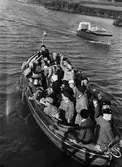 Barn ombord på båt som ska ta dem till "Barnens ö" vid Liljekonvaljeholmen under Barnens Dags-firandet, Fyrisån