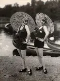 Från Nordiska Kompaniets mannekänguppvisning av baddräkter vid Saltsjöbaden. Två modeller i baddräkt håller var sitt parasoll.