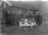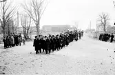 Begravningståg i Strömslund med bl a Strömslundsgatan 48 i bakgrunden och skylten bageri. Namnet otydligt - troligen Gustavssons bageri. Emil Gustavsson, Särestad 1877, hade bageri här från cirka 1907 till 1919.