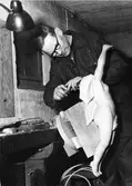 Bildhuggare Reinhold Pettersson på arbetsplatsen med en konsol huggen i sten