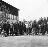 Pensionsavtackning på CVA. Två män och en kvinna uppvaktas med blommor av chefen. Bordet är dukat för kaffe och bullar. I en kruka står en pelargon. Längst till vänster: Nils Andersson. Längst till höger: Anders Högfeldt.